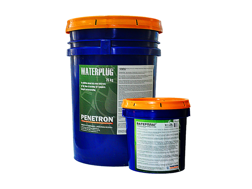 Сухая строительная смесь «Ватерплаг», относящаяся к системе материалов проникающей гидроизоляции Пенетрон, преназначена для быстрой ликвидации напорных течей в конструкциях, выполненных из бетона, кирпича, натурального камня. Материал применяют в случаях, когда другие составы (Пенетрон, Пенекрит) вымываются водой.