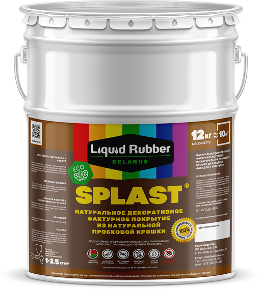 Liquid Rubber SPLAST® - это жидкая смесь из натуральной пробковой крошки и специальных акриловых полимеров на водной основе, технических добавок и пигментов, которая наносится методом воздушного распыления на любой тип материалов и на любую поверхность. Простота в применении, эстетичность, функциональность, долговечность и лёгкость в эксплуатации – все необходимые для идеального результата качества объединены в одном продукте.